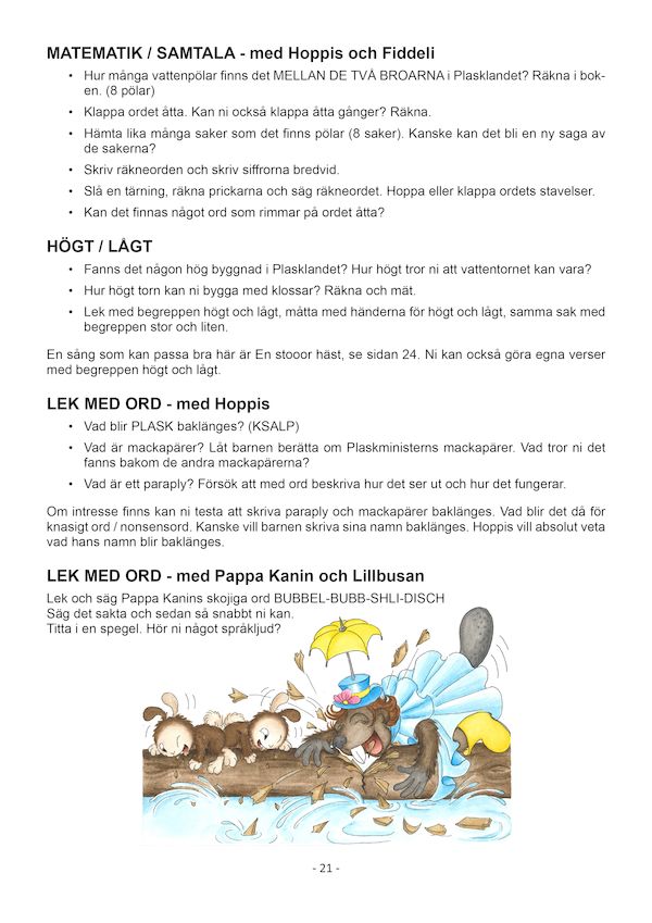 Lärarhandledningen är uppdelad i fem avsnitt utifrån boken. Här hittar ni tips på språklekar som passar till de olika sidorna.