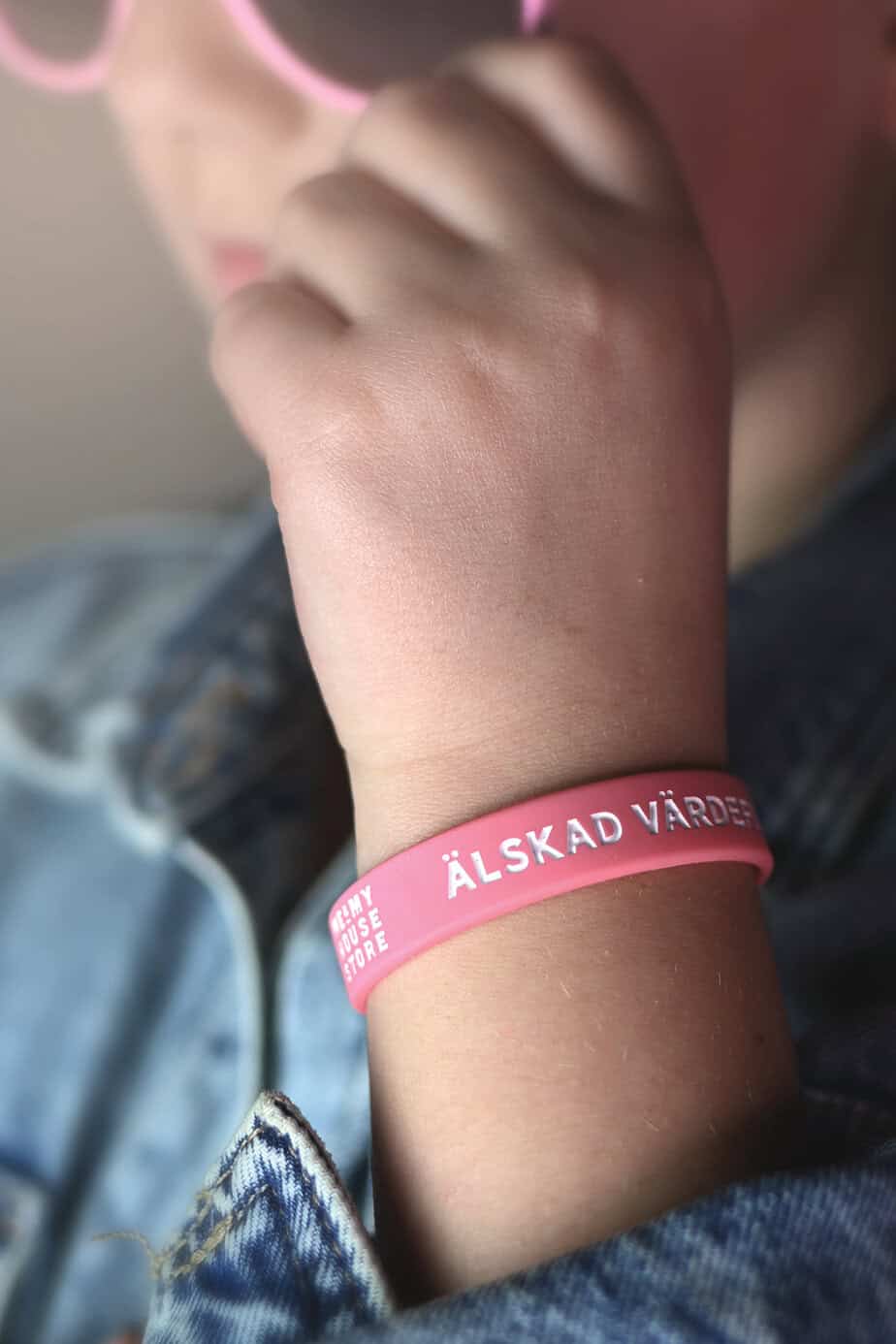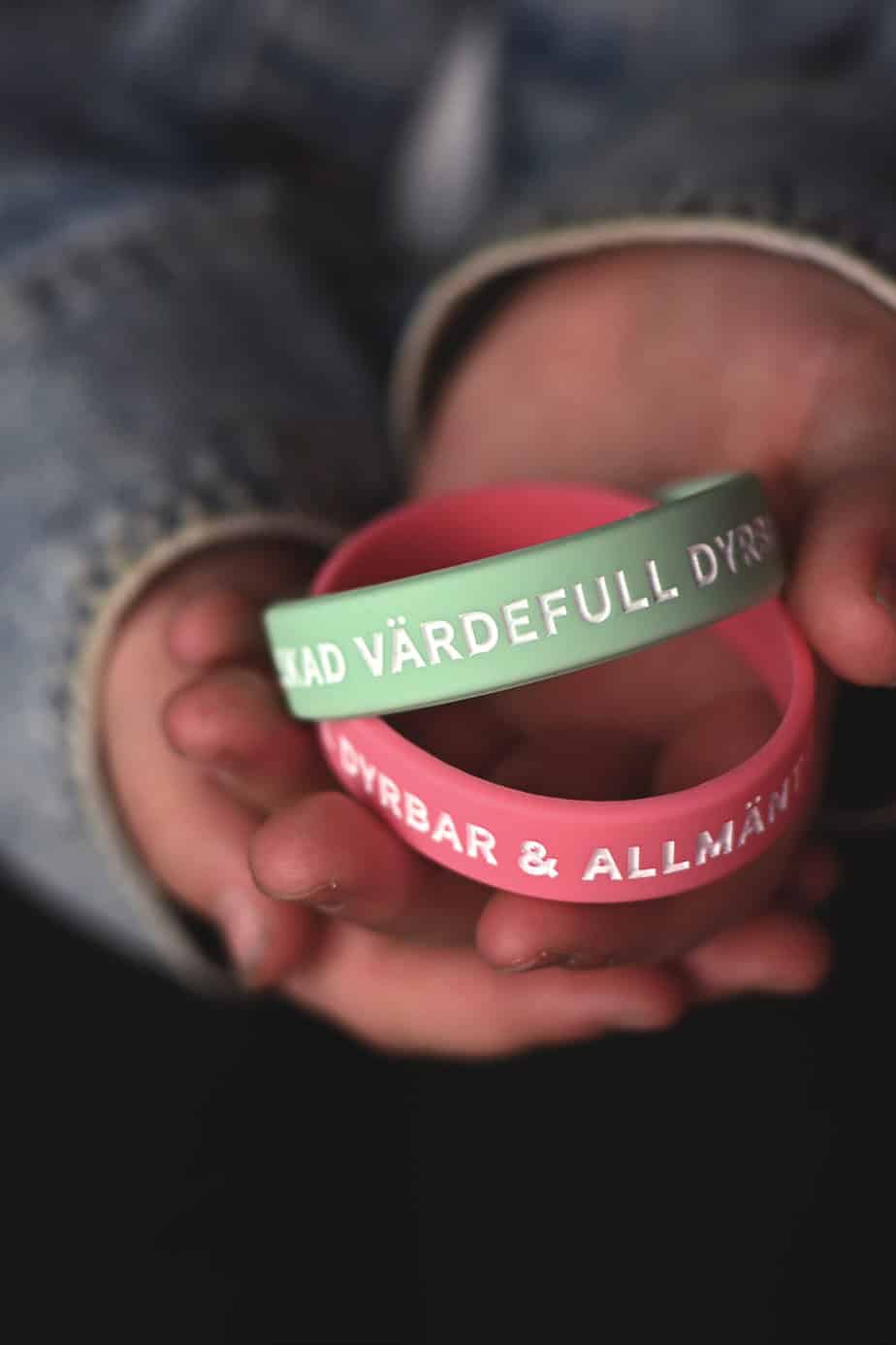 Snyggt, mjukt armband med vit text präglat ner i armbandet.