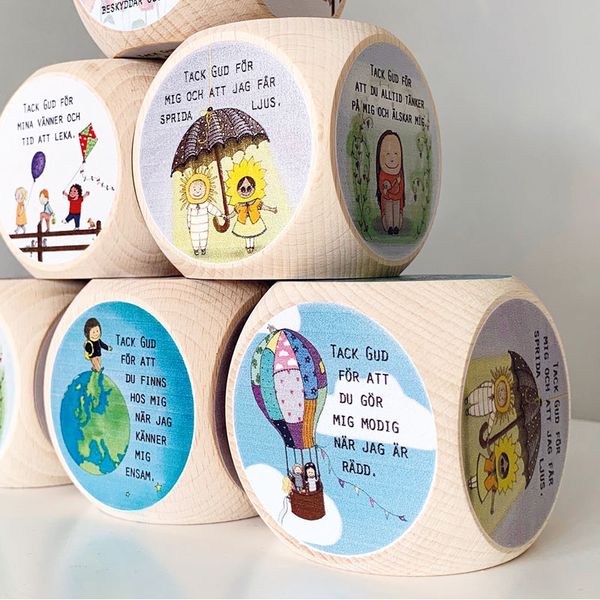 Stor tärning med 6 tackböner. Tillverkad i lönnträ.