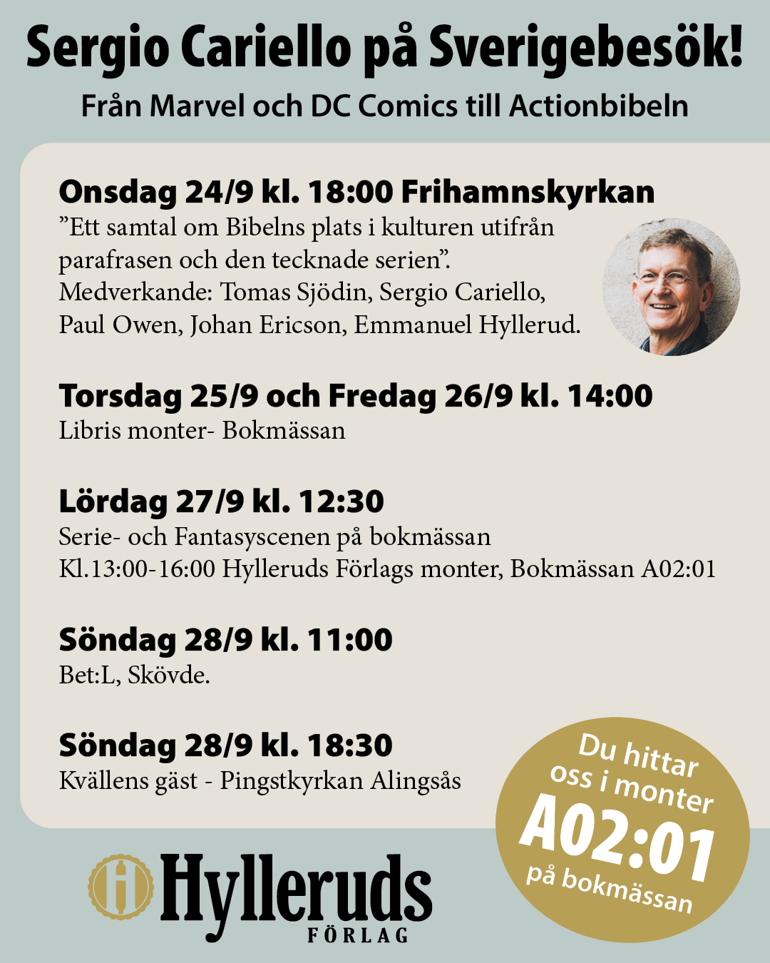 Medverkande: Tomas Sjödin, författare, Sergio Cariello, illustratör till Actionbibeln, Paul Owen, David Cook Publishing, Johan Ericson, Libris förlag, Emmanuel Hyllerud, Hylleruds förlag.